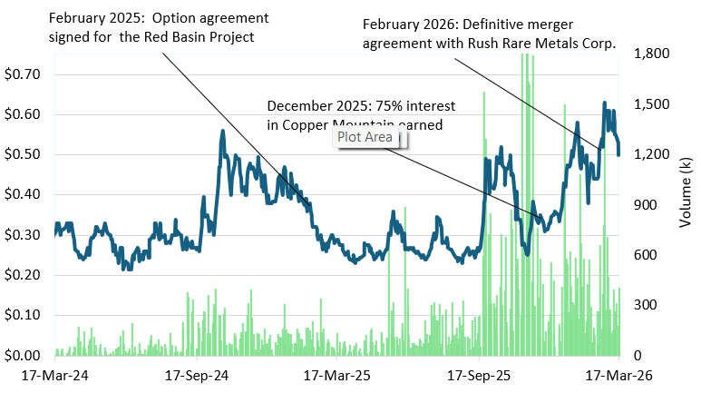 Merger with Rush Rare Metals. Special Rush shareholder meeting on or before May 2026.