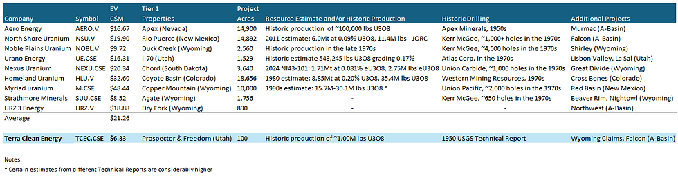 Our US-based peer group is populated with pre-resource companies which have active programs largely in the Four-Corner states or in Wyoming. Moreover, much like Terra’s new US Projects, the respective peer-group Projects also either contain a certain degree of historic production and/or contain a certain historic resource estimate. Particularly for a pre-resource company, these are the factors we consider as critical when it comes to choosing Projects worthy of development capital, formulating future drill programs and then the publishing (hopefully) of an updated mineral resource estimate (MRE).